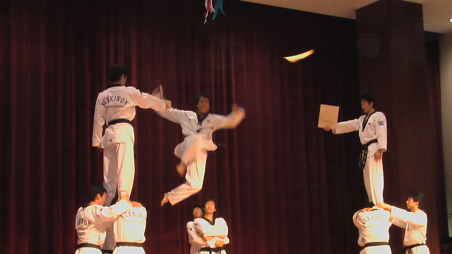 夕食後にテコンドー・ショーを見るために前方の席に座ったら、英語通訳の女性がやってきて私に韓国語で声をかけた。ことばが分からないという表情をすると、今度は英語でここは危険ですから、もう少し後ろに下がってください≠ニいう。これには驚いた。テコンドーは見るだけでも危険なのかしら。ひょっとして、投げつけられた人間が飛んできたりして。なんとも恐ろしいものだと思いながら少しばかり後ろの座席に移動した。ショーが始まってから、あの忠告の意味が理解できた。わぉーっ≠ニいう気合いの声と同時に繰り返し板を蹴破るのである。その結果、見事に割られた板の破片が飛んでくる。それが危険だというわけだ。それにしても、通訳の女性には私が外国人かどうか分からなかったようだ。そう言えば、学会1日目の朝にも受験生のオヤジさんらしき人から、△※◇○◎□…≠ニ声をかけられた。まあ、お互い蒙古斑のできるモンゴロイドである。顔を見ただけでは韓国人か日本人かは分からないということだ。それでも空港で買い物をする ときなどは、いきなりこんにちは≠ネんて言ってくる。国際線だということもあるのだろうが、プロが見るとどこか違うのかもしれない…。さてテコンドー・ショーだが、総勢25名ほどの若者たちがダイナミックな技を見せてくれた。私などが見ると空手との違いすら分からない。まあ正確に言えば、空手だってろくに知らないから、そもそも違いが分かるわけもない。ともあれ、あの構えをされただけで、やたら強そうな感じがする。手の突きや蹴りは目にも止まらぬスピードだ。まさに一撃で骨を砕き、身を切ると思えるほどの迫力があった。体力は軟弱で運動神経も怪しい私としては口を開けて見ているだけだった。 |