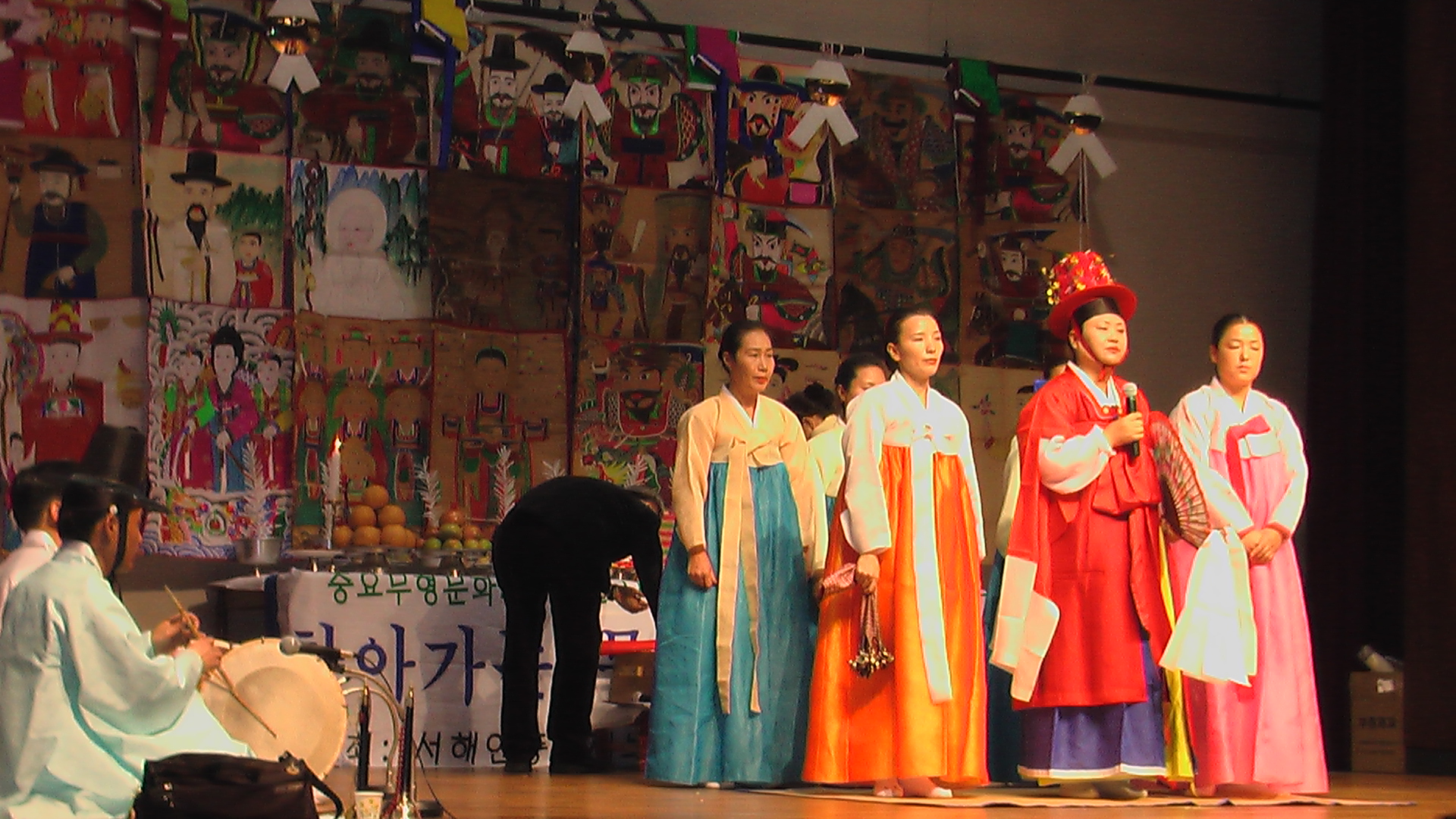 テコンドー・ショーの途中にはビートのきいた音楽が流れ、ダンスのように見える演技もあった。こちらの方もリズムに乗って、観客の方もつい手を叩き、身体を動かしたくなってくる。あんな感じなら、現代の若者を引きつけるのではないかと思った。それに続いて女性が登場して、伝統楽器を演奏した。歌詞はさっぱり分からないが、ハスキーな声で歌も唄った。こちらはなかなか魅力的だった。そして、いよいよメインイベント、悪魔払いの儀式となる。日本なら白装束の巫女さん登場という状況だ。ところが韓国では相当に雰囲気が違っていた。何といっても着ているものの派手なことこの上ない。赤・青・緑に黄色と白…。とにかく原色の鮮やかな装束の女性が舞台の上で踊る、手を振る回転する…。農作業に使うような刃物を手に当てる、足に押さえつける。さらには、その上に乗る。その間も絶え間なく呪文を唱える。もちろんセリフはまったく分からないが、とにかく異様な雰囲気が漂っている。これに耳を劈く鳴り物が入る。最後は、会場にいた観客ま で浴衣のような上っ張りを着せて舞台に引き上げて踊る。太鼓や銅鑼はますますそのボリュームをあげる。そしてまさに気を失うばかりの絶頂に達して終焉を迎える…。あまりプラスの表現ではないが、一言で言えばけばけばしく、かつ激しいのである。最後はお供えのものをみんなに配る。私も、やたらと大きな梨とあめ玉をもらった。それにしても、装束の派手さや音の強烈さは、ものすごいものがあった。しばらく時間が経っても、それはそれは目にも耳にもしっかり残っていた…。そう言えば、韓国の寺院などを見ると赤や緑の原色が強いような気がする。屋根のそり具合にしても強烈に自己主張しているように見える。 |
