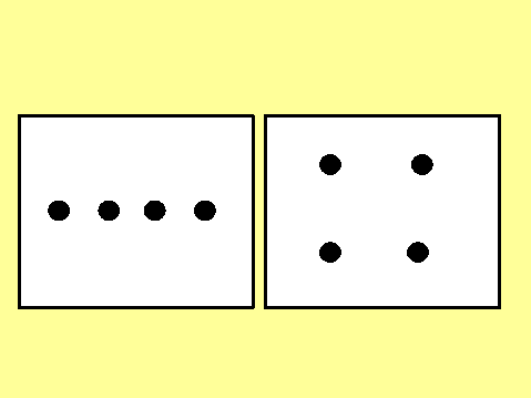 gestalt≠ヘドイツ語で形態≠ニいう意味である。彼らはドイツを中心に活動していたが、ユダヤ系の研究者が多くを占めていた。やがてヒトラーが率いるナチスがドイツを支配し、ユダヤ人に対する迫害がはじまった。そこで多くのユダヤ系研究者がアメリカに逃れたことは、わが国でもよく知られている。レビン氏もその中の一人なのである。ゲシュタルト学派≠フ発想は、その当時の心理学の領域では新鮮さが際だっていた。それまでは、ひとのこころ≠構成する要素≠ェあると考える傾向が強かった。そのため、心理学の仕事はこころの要素≠探すことが重視される。その当時も科学の領域では、分子 や原子など物質を作りあげる元素がどんどん発見されていた。だからこころ≠セって、それを構成する元素のようなものがあるはずだ。なるほど、そう言われればそんな気にもなる。たしかに今日でもこころ≠フ大元は大脳だということは、はっきりしている。そして、その大脳は間違いなく1個1個が独立した細胞から構成されているのである。やっぱし、こころの素があるに違いないと思いたくなる。これに対して、個々の要素ではなく全体の構造を見る必要があることを強調したのがゲシュタルト学派≠ナあった。同じ4つの黒い点を横に並べば線に見える。しかし、2個ずつ離して平行に置けば四角形ではないか。 |