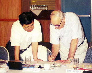 心理学が自然科学を父と勘違いしたのではないか。そんな文句を言いながら、その一方でこころ≠数式にしたらおもしろいなんて考えてしまうのである。われながらいい気なものだと思う。もちろん、数式といっても私流のもので、まあこころの算数≠ニいった感じである。当然のことながら、それはこころ≠客観的に測定できるような数式ではない。簡単に言えば、ことば遊びに過ぎない。しかし、それが少しでも人の気持ちにひっかかってなるほどそれはそうだなあ≠ニ受け止めていただければ大満足するのである。これぞ究極の自己満足だと思う。こんなところで居直っても仕方ないが、私としては自己満足≠ナきる力=自己満足力≠ヘ、人生を豊かに生きるために欠かせないと考えている。心理学には自己効力感≠ニいう概念がある。心理学者のバンデューラ(Bandura)が提唱したもので、原語はself-efficacy≠ナある。英和で引けばefficacy≠ヘ薬などの効きめ、有効性、効果≠ニなっている(ジーニアス英和)。与え られた状況の中で自分はうまくやれる≠ニいう期待と確信のことである。これが新たな行動の動機づけにもなる。自己効力感≠ノついては夥しい数の研究が行われている。このバンデューラ先生と親しく(?)接して話をする機会を持ったことがあるというのが私の自慢話のひとつである。そこで自慢ついでに証拠写真を貼り付けておこう。これは1996年1月にシドニーで行われた組織の安全に関するワークショップでの1コマである。右がバンデューラ氏で左にいるのが私である。このとき私は40代、さすがに若そうに見える。生まれて初めて南半球のシドニーに行った。夏の盛りのシドニーで正月を迎えたのである。 |