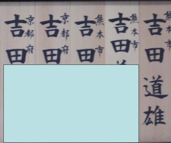 私は熊本城主の1人だ。熊本城は西南の役で焼け落ちたが、戦後天守閣を中心に復興された。石垣は燃えないからしっかり残ったが、このカーブが素晴らしく美しい。それを武者返し≠ニ呼ぶ。敵が下からよじ登ってきても、途中でひっくり返って落ちてしまう。そんな曲線なのである。城主≠ナある私は、その熊本城を毎日眺めながら通勤している。けっこうな身分である。石垣そのものは築城このかたずっと同じ形状だが、季節によって周りの雰囲気が変わる。春の桜の時期はもっとも華やかなときの代表で、文字どおり画になる。ライトアップの光で花見をしている人々のシルエットが石垣に映る。一瞬、戦国の宴を見ているような錯覚を覚える。その熊本城の築城400年を記念して、復元事業が進められてきた。一昨年の2007年がその年だったが、メインというべき本丸御殿が復元され、城の風格がさらにレ ベルアップした。その翌年だったか、熊本城は城として日本で一番の観光客を呼び込んだ。常連は首里城だという。ところで、復興事業の資金に充てるため、かなり以前から寄付金の募集がはじまった。一口が10,000円だが、それで城主≠ノなれるという触れ込みである。私もけっこう乗りやすい質である。そこで、わが家も城主≠ノなる決断をした。その制度がスタートして間もない2005年のことだ。もちろん私だけではなく、家内と娘、そして別世帯の息子夫婦の5人がめでたく城主≠ノなった。その際に家内の母もそれではお父さんと一緒に≠ニいう話になった。そこですでに他界していた義父も含めて、わが家と同じときに城主登録≠した。そのときは、一人ひとりの名前を木札に書いて掲示することになっていたので、合わせて7人が連なった(写真)。 |