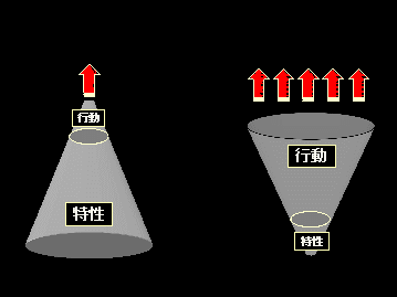 さて、今日は〝二つの円錐図〟を使ってリーダーシップについて解説しよう。まずは左の円錐を見ていただきたい。「特性」が底辺からどっしりと鎮座ましましている。その先端部分には「行動」が細々という感じで乗っかっている。この円錐で、「リーダーシップはリーダー個人の『特性』で決まる」ことを強調したつもりである。つまりは状況が変わろうと、相手が違おうととにかくワンパターン、「これしかできない」で貫くのである。これはもう柔軟性ゼロのリーダーシップ精神だと言っていい。これに対して右側の円錐は逆立ちしている。こちらも「特性」があって、その上に「行動」が乗っている状況は、特性論の円錐と同じである。しかし、強調したいことはまるで正反対なのだ。リーダーシップに関して「特性」を無視はしない。しかし、そうした特性を乗り越えて、さまざまな「行動」にチャレンジし続けることがリーダーに求められてい るのである。