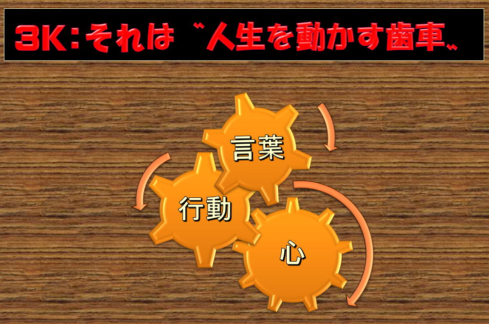 皆さんの反応がよろしいので、「新『3K物語』」のスライド をワクワクしながら創りあげました。 タイトルは「3K:それは〝人生を動かす歯車〟」です。歯車の特性として、「1.歯車は『三位一体』」「2.どれから動かしても3つは回る」「3.いつも回していないと錆び付く」の3点セットを提示します。さらに「錆び」からヒントを得て「潤滑油」も考えてみました。それによって歯車がスムーズに回転するわけです。