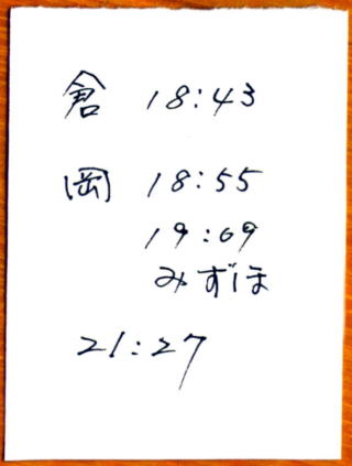 復路のメモは、「岡 18:55」の下に「19:09」と記し、さらにその下に「みずほ」と書いて、最後の行は「21:27」になる。これは「18時43分発の在来線が岡山に18時55分に着きき、19時09分の『みずほ』に『乗り換え、熊本着は21時27分になる」ということである。