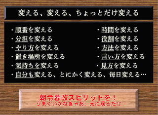 | 変える、変える、ちょとだけ変える 2019/12/11 Wed 6643 昨日の続き 私の「ネタ」に「チェンジ」に関するものがある。タイトルは「変える、変える、ちょっとだけ変える」だが、これは「がっちりマンデー」の「地味チェンジ」と同じである。 講演の際は、ご覧のスライドの下線部分をクリックしながら小出しにしていく。組織の「制度やシステム」を変えるには労力と時間、そしてお金もかかる。また、講演を聴いていただいている方だけでは変えられないこともある。そこで、まずはリーダーが「仕事や身の回りのこと」を見直して、「小さな変化」を先導することからはじめましょうとお勧めするのである。それでも「小さな変化の積み重ね」が結果として「大きな変化」につながっていく。 ![]() その具体的なものとして、「順番を変える」ことを第一に挙げた。世の中に「歯を磨いて食事をする」人はいないだろう。ましてや「靴を履いてズボンをはく」人だっているわけがない。それはもう喜劇の世界である。しかし、そんな「喜劇」を日常の仕事で演じてはいないか。ただ「順番を入れ替えるだけ」で仕事の効率が飛躍的に改善されることがあるはずなのであある。 ところが現実には、「これまで『こうしてきた』から」とか、検証もしないで「そんなことしても同じこと」、さらには「かえって効率が悪くなる」などといった理屈をつけて頑なに「順番」を守ってはいないか。 |