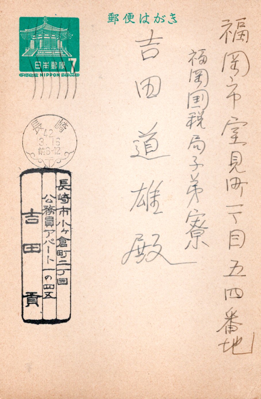 九大合格のテレビを見、ラジオをテープにとってあった合格者のところで吉田道雄というのを三度聞いて、今昭和42年3月16日午前3時9分である。合格お目出度う。と同時によくやって呉れた。有難うと言いたい。このみすぼらしい酒も煙草もやらぬ貧弱なパッとしない野暮な親父をどれだけ勇気づけて呉れることか。