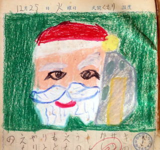 Aが小学2年生の冬休み、1956年12月25日の絵日記 きのう待ちに行ってサンタの面のついたおかしをかって来ました。そしてきょうの朝五時半、□□(妹)ちゃんのまくらもとへいって、てまりとおかしをおいてやりました。□□ちゃんは、ほんとのサンタのおじいさんが来たのかと思って「どんなにして来たのやろうか」とふしぎそうにつぶやきました。それでぼくがいいました。「にいちゃんがサンタのお面をつけてふくろをさげて来たんよ」といいました。おわり。